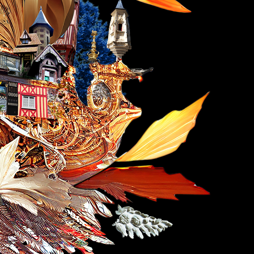 Ma recherche était autour d’un bateau volant dans un style qui ressemble à l’architecture de Rouen, de couleur claire et dorée. C’est ma première utilisation de Midjourney pour une création.